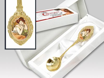 pozłacane łyżeczki zdobione arcydziełami Alfonso Muchy zapakowane w prezentowe pudełko