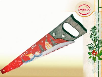 Mała czerwona piła pomoże w przedświątecznych pracach domowych. Ozdobiona jest wizerunkiem bałwanków stojących w zimowym krajobrazie.-