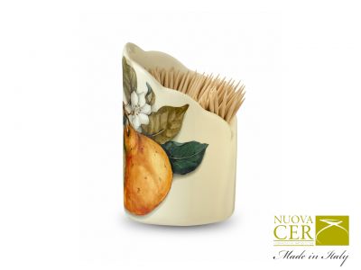 Urokliwy pojemnik na wykałaczki wykonany z ceramiki o bardzo delikatnym. kremowym odcieniu. ozdobiony soczystymi owocami to idealna dekoracja domu z odrobiną humoru we włoskim stylu. Owoce malowane z dbałością o najmniejszy szczegół przywodzą na myślspacery po sadzie i jedzenie...