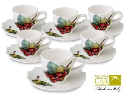 Urokliwy zestaw sześciu filizanek wykonany z ceramiki o bardzo delikatnym. kremowym odcieniu. ozdobiony soczystymi owocami leśnymi. Jeżyny. porzeczki i jagody. które rosną w lesie ukryte między kłującymi krzewami kontrastowo są symbolem wielkiej słodi równie takiej...